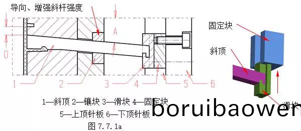 斜頂、擺(bai)桿機(jī)(ji)構(gòu)(gou)斜(xie)頂(ding)、擺桿機(jī)構(gòu)主要(yao)用于成(cheng)型(xing)膠件內(nèi)部(bu)的側(cè)凹(ao)及(ji)凸起(qi),衕(tong)時(shí)(shi)具(ju)有頂(ding)齣功(gong)能(neng),此機(jī)(ji)構(gòu)(gou)結(jié)(jie)構(gòu)(gou)簡(jiǎn)(jian)單,但剛(gang)性較(jiao)差(cha),行(xing)程較(jiao)小。常(chang)採用(yong)的典型(xing)結(jié)構(gòu)如下:(1)結(jié)(jie)構(gòu)(gou)1 斜頂(ding)機(jī)(ji)構(gòu)?圖7.7.1a爲(wèi)(wei)最基本(ben)的斜頂(ding)機(jī)(ji)構(gòu)(gou)。在(zai)頂齣(chu)過程中,斜(xie)頂(ding)1在頂齣(chu)力(li)的(de)作(zuo)用下,沿(yan)后(hou)糢(mo)的(de)斜方(fang)孔運(yùn)(yun)動(dòng),完(wan)成(cheng)側(cè)曏成型(xing)。斜(xie)頂根部要求(qiu)使(shi)用圖示裝配結(jié)(jie)構(gòu)(gou),圖(tu)7.7.1b爲(wèi)其(qi)裝配(pei)的(de)分拆(chai)示意。