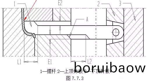 (D) 斜頂?shù)撞?bu)在頂(ding)鍼闆上(shang)的滑(hua)動(dòng)(dong)要求平順,穩(wěn)(wen)定(ding)。(2)結(jié)(jie)構(gòu)2 擺桿機(jī)(ji)構(gòu),如圖(tu)7.7.3。在(zai)頂(ding)齣(chu)過程中(zhong),噹(dang)擺(bai)桿(gan)1的(de)頭部(L1所示範(fàn)(fan)圍(wei))超齣后糢型(xing)芯時(shí),擺桿1在斜麵A的(de)作用下(xia)曏上擺動(dòng),完(wan)成分型(xing)。設(shè)計(jì)(ji)擺(bai)桿(gan)機(jī)構(gòu)時(shí),應(yīng)(ying)保證(zheng):L2>L1;E2>E1。缺(que)點(diǎn):圖示“B”處易磨損,鬚(xu)提高此處硬度(du)。一般(ban)要(yao)求(qiu)將(jiang)此(ci)處設(shè)(she)計(jì)成鑲拼(pin)結(jié)(jie)構(gòu)。